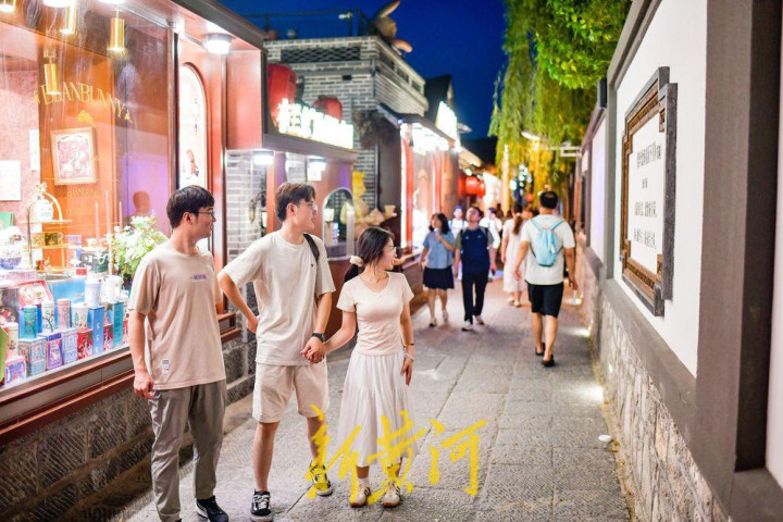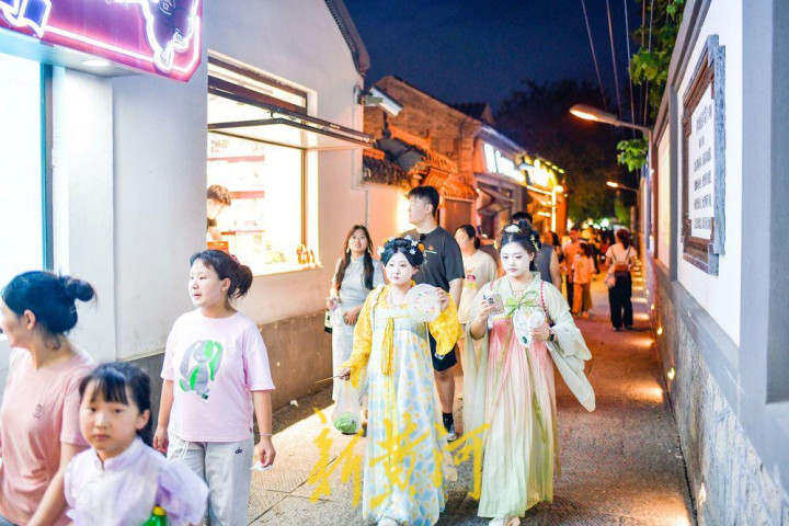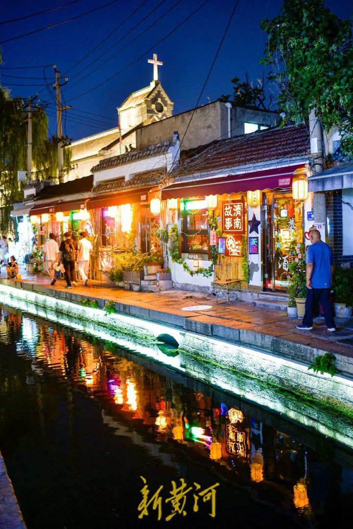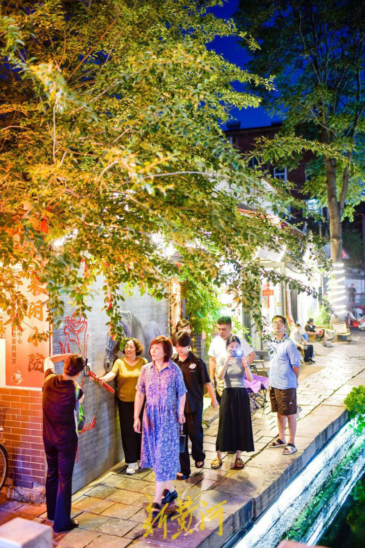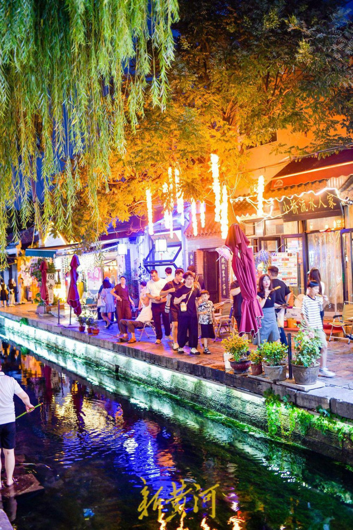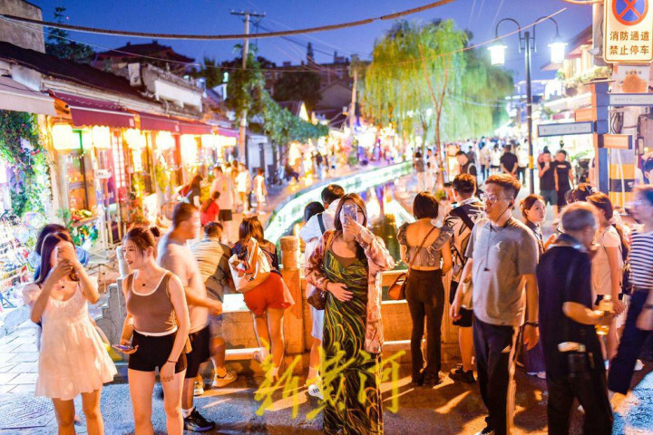 7月12日,在老城区的曲水亭街,沿街是古旧的宅子和潺潺的流水,夜幕降临时,各种装饰彩灯亮起,沿街的店铺在夜色中绽放出迷人的风情。众游客夜晚来到曲水亭街,避暑纳凉的同时游览老街美景,看着潺潺的流水和弯弯的小桥,感受老城的活力和烟火气。